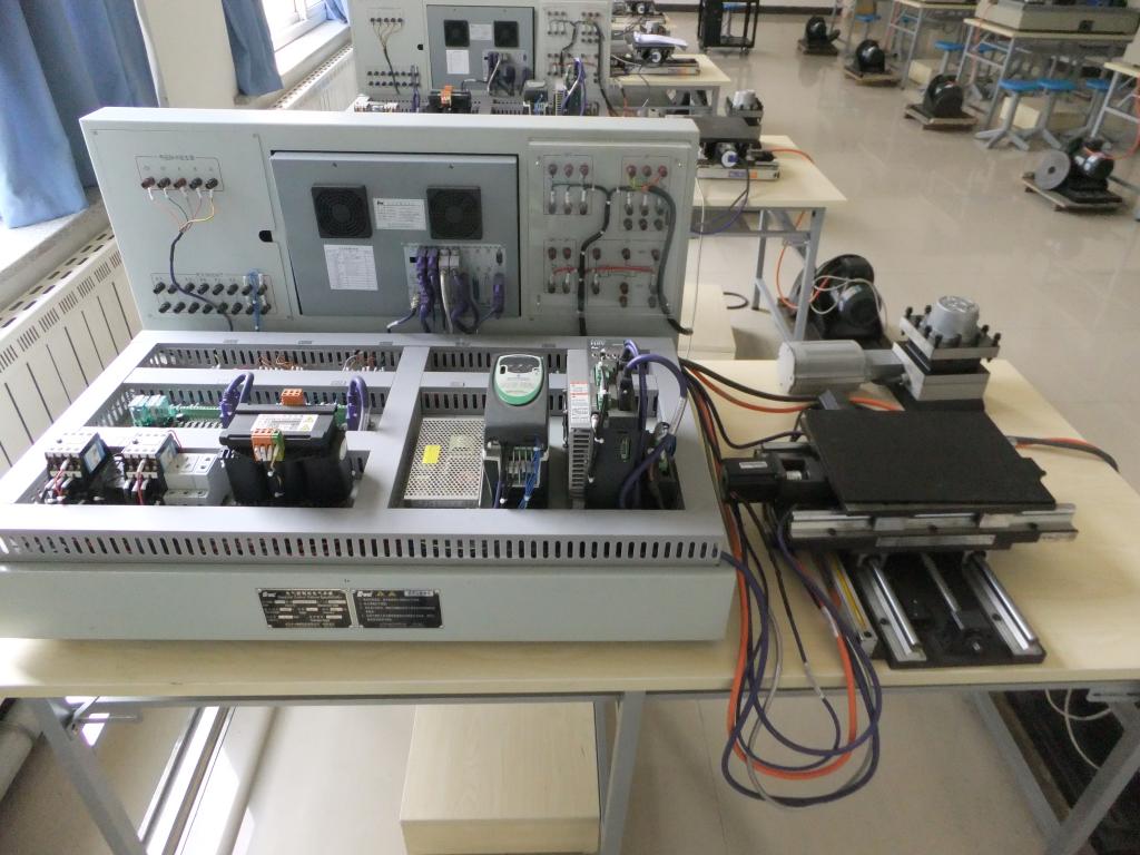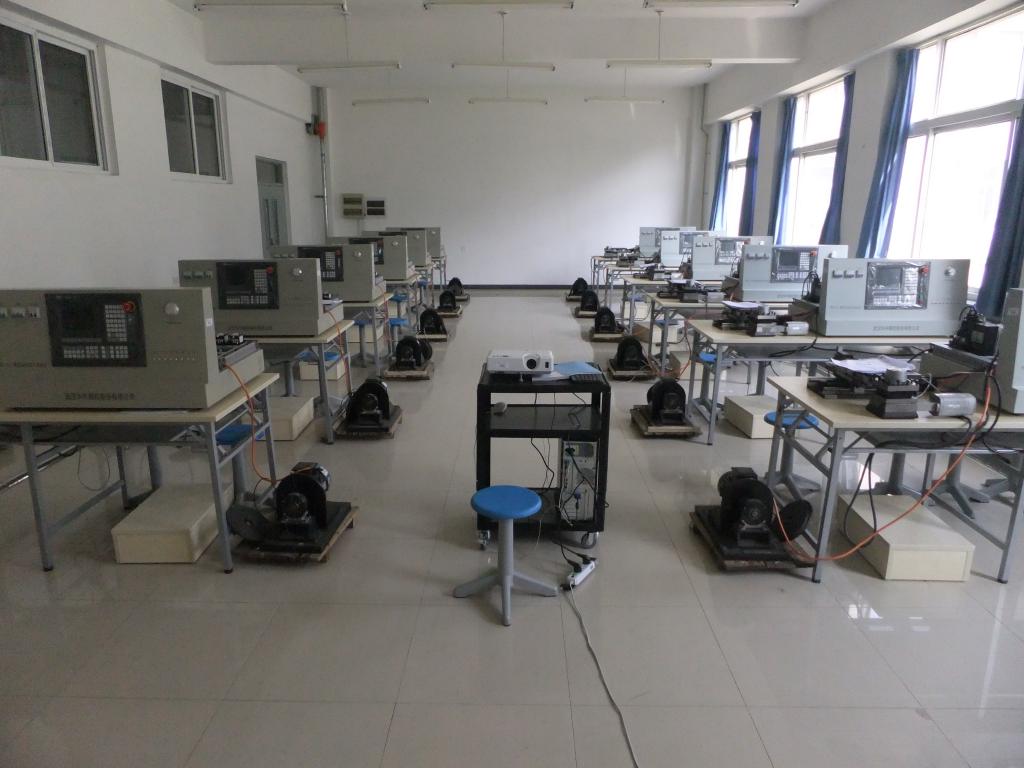 数控技术室现有12套华中数控研发的HNC-21TF系列综合实验台,该实验台主要由HNC-21TF数控装置、变频调速主轴及三相异步电动机、交流伺服电动机及伺服单元、步进电动机及步进电动机驱动器、测量装置、十字工作台组成。该装置能够模拟数控车床现场运行过程,直观便捷,使学生掌握数控技术相关课程所学数控机床的各部件及功能,通过课内实验及实训,学会了解数控电气连接、安装、调试、及其相关故障维修诊断等,提高学生对数控机床结构部件的理解应用实践能力。