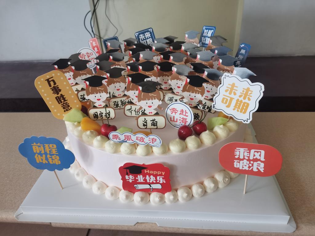 班委会提前给肖老师预定了鲜花,代表班级同学对老师四年的辛勤付出表示感谢。还为大家准备了西瓜和蛋糕,蛋糕上写满了班级所有人的姓名(包含当兵入伍的同学)寓意祝愿大家前程似锦,青春不老,我们不散!蛋糕由班主任肖老师切开第一刀,满满的仪式感!最后大家在合唱《不说再见》的歌曲旋律中此次班会圆满结束。最后,特别感谢班级6位党员同志慷慨解囊,提供班会活动资金!